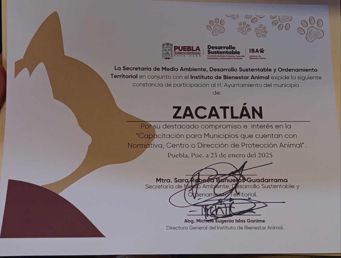 El gobierno del estado a través de la Secretaría de Medio Ambiente, Desarrolló Sustentable y Ordenamiento Territorial en conjunto con el Instituto de Bienestar Animal, reconocieron a Zacatlán como un municipio que implementa acciones encaminadas al cuidado de los seres sintientes.