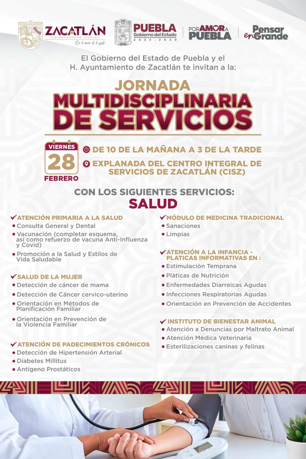La jornada Multidisciplinaria de Servicios se llevará a cabo este viernes 28 de febrero, a partir de las 10 de la mañana, en la explanada del Centro Integral de Servicios de Zacatlán (CISZ), y contará con servicios de Salud, de Bienestar Animal, entre otros que brinda el gobierno estatal.