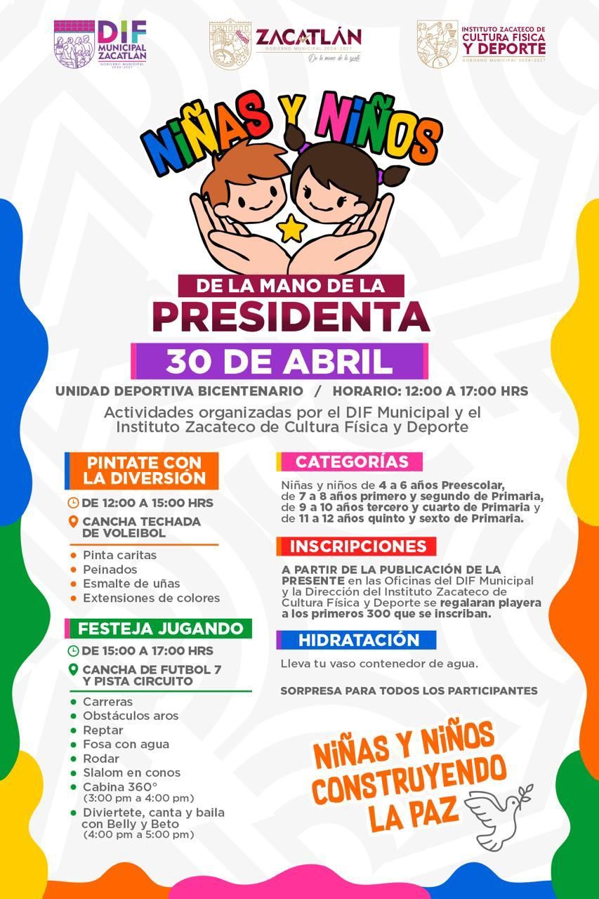 Y el 30 de abril no dudes en llevarlos al rally “Niñas y niños de la mano de la presidenta”, en la Unidad Deportiva Bicentenario, de 12 del día a 5 de la tarde, evento organizado por el DIF Municipal y el Instituto Zacateco de Cultura Física y Deporte.