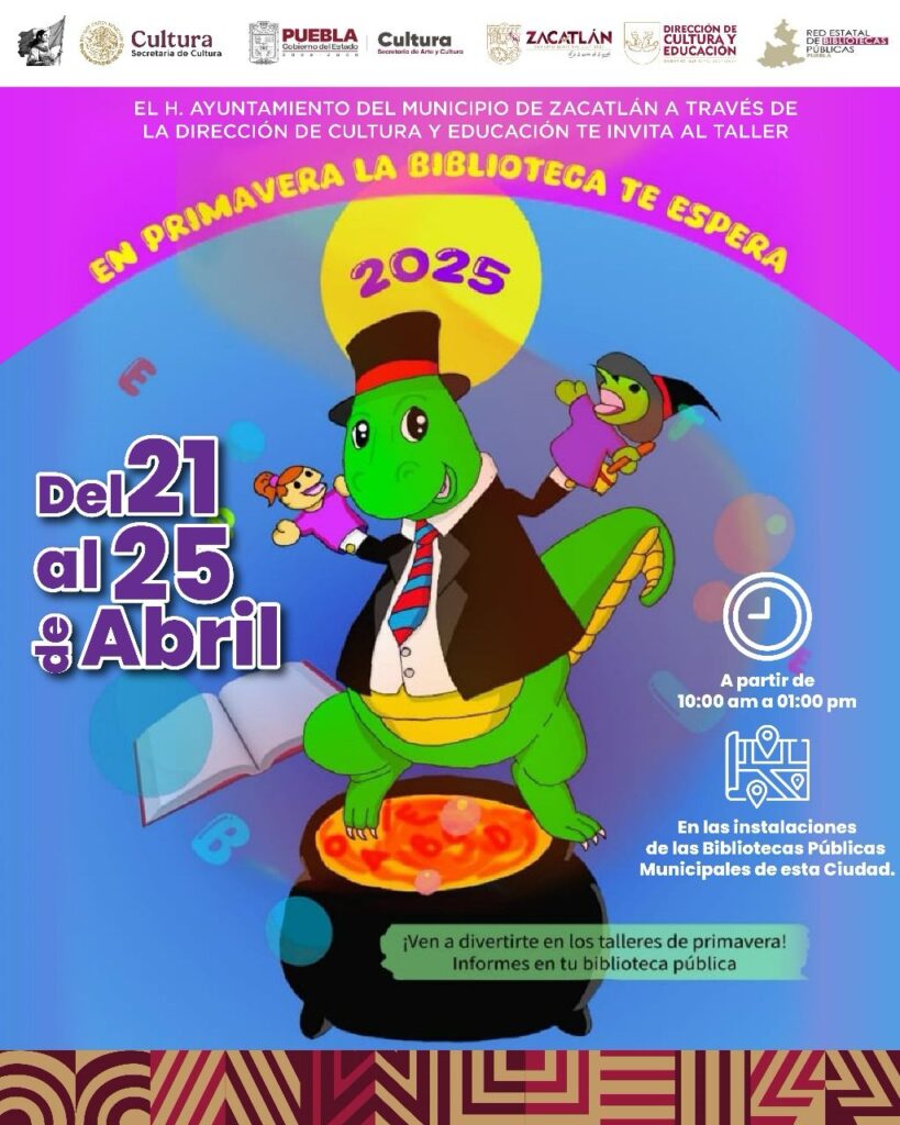 A partir de este lunes 21 y hasta el viernes 25 de abril, las niñas y los niños podrán disfrutar de actividades lúdicas con el programa “En Primavera la Biblioteca te Espera”, de la Dirección de Arte y Cultura del municipio. Se trata de talleres, cuentacuentos y muchas cosas más en las distintas bibliotecas públicas de Zacatlán con un horario de 10 de la mañana a 1 de la tarde.