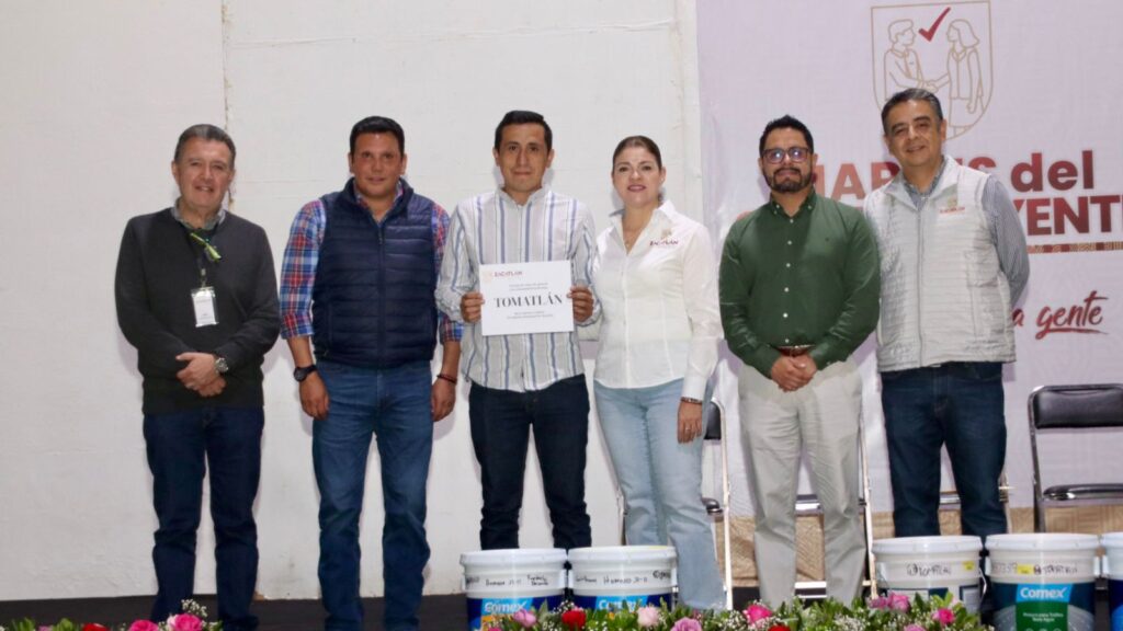 Durante el Martes del Contribuyente, la presidenta municipal, Bety Sánchez entregó diversos apoyos como botes de pintura, láminas, entre otros materiales a los presidentes auxiliares de Tomatlán, Ángel Pérez Paniagua, José Luis Martínez de Camotepec, así como a inspectorías y colonias.